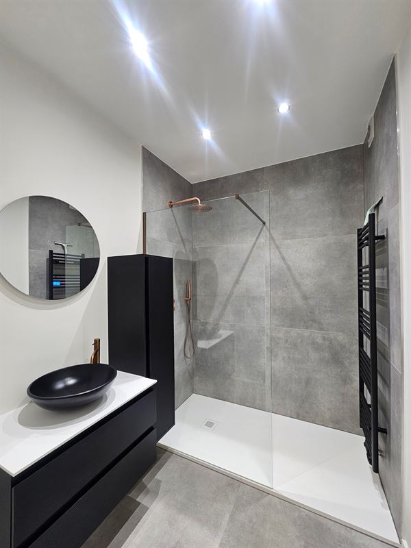 Modern ingerichte badkamer met inloopdouche en lavabomeubel.
