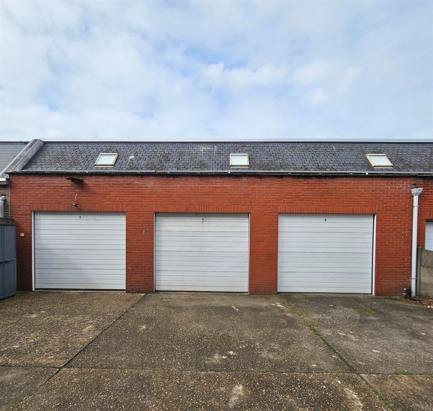 Garagebox achteraan het gebouw met elektrische sectionaalpoort en aansluiting elektriciteit, verplichting om mee aan te kopen voor 19.000 €.