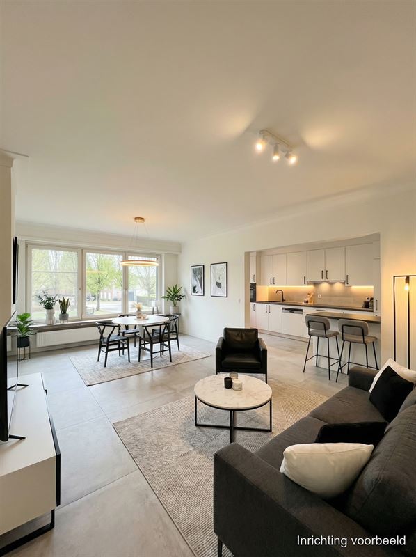 Een lichtrijke leefruimte op laminaatvloer met een open keuken die toegang geeft tot het overdekt terras. De moderne nieuwe keuken beschikt over volgende toestellen: oven, vaatwasser, kookplaat met dampkap , koelkast met diepvries.