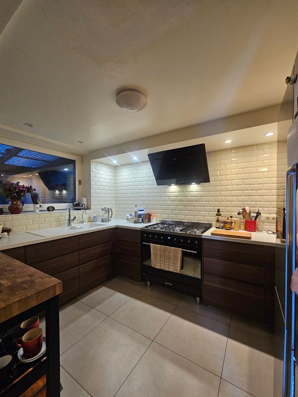Ruime leefruimte (40m²) met aansluitend de eetkamer en de volledig geïnstalleerde, moderne keuken.