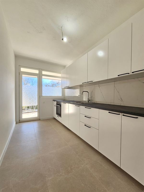 Lichtrijke leefruimte en aansluitend de keuken met toegang naar het terras vooraan. De keuken beschikt over volgende toestellen: afwasmachine, oven, kookplaat, dampkap en aansluiting voor wasmachine en droogkast.